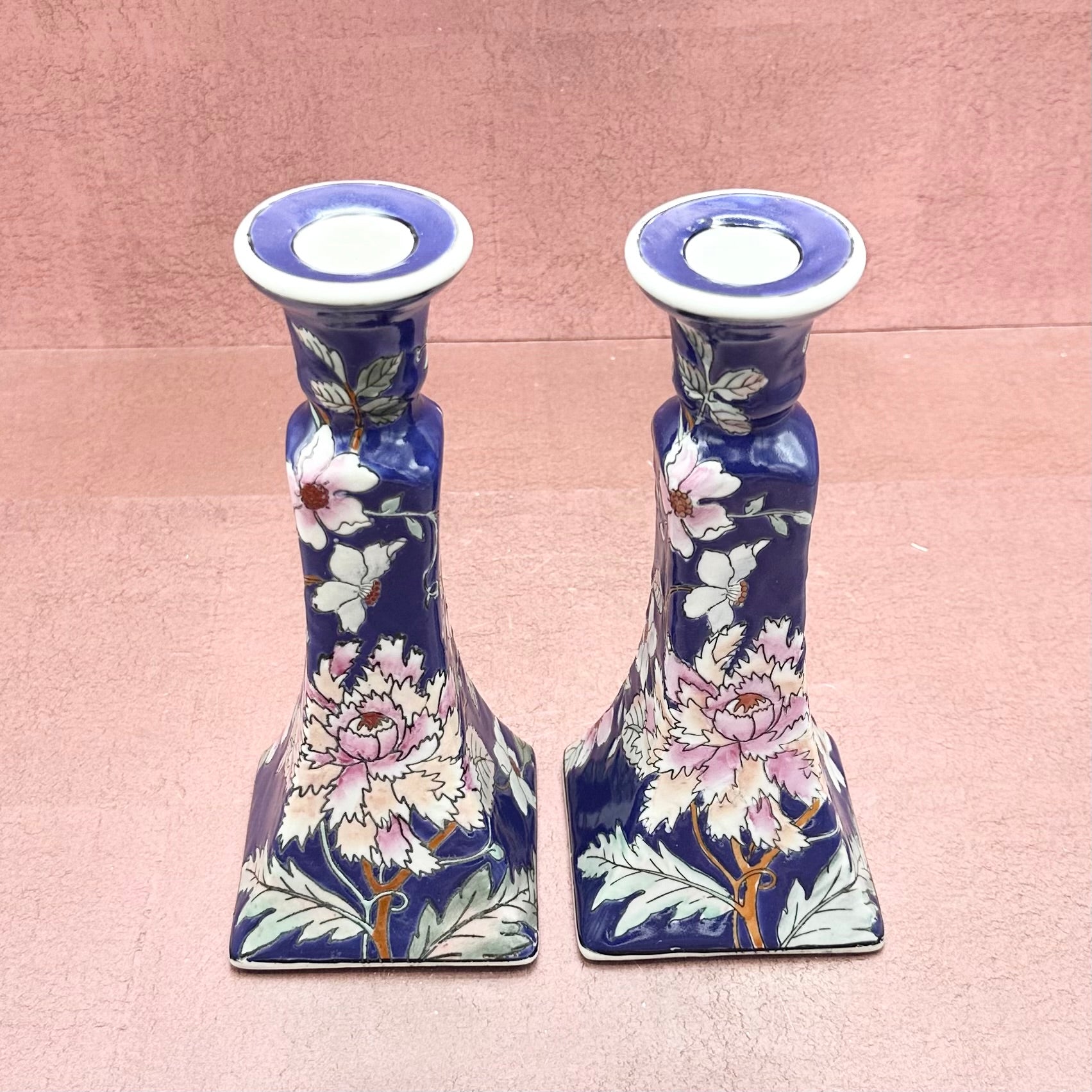 Navy Floral Vintage Porcelain Candle Holders
