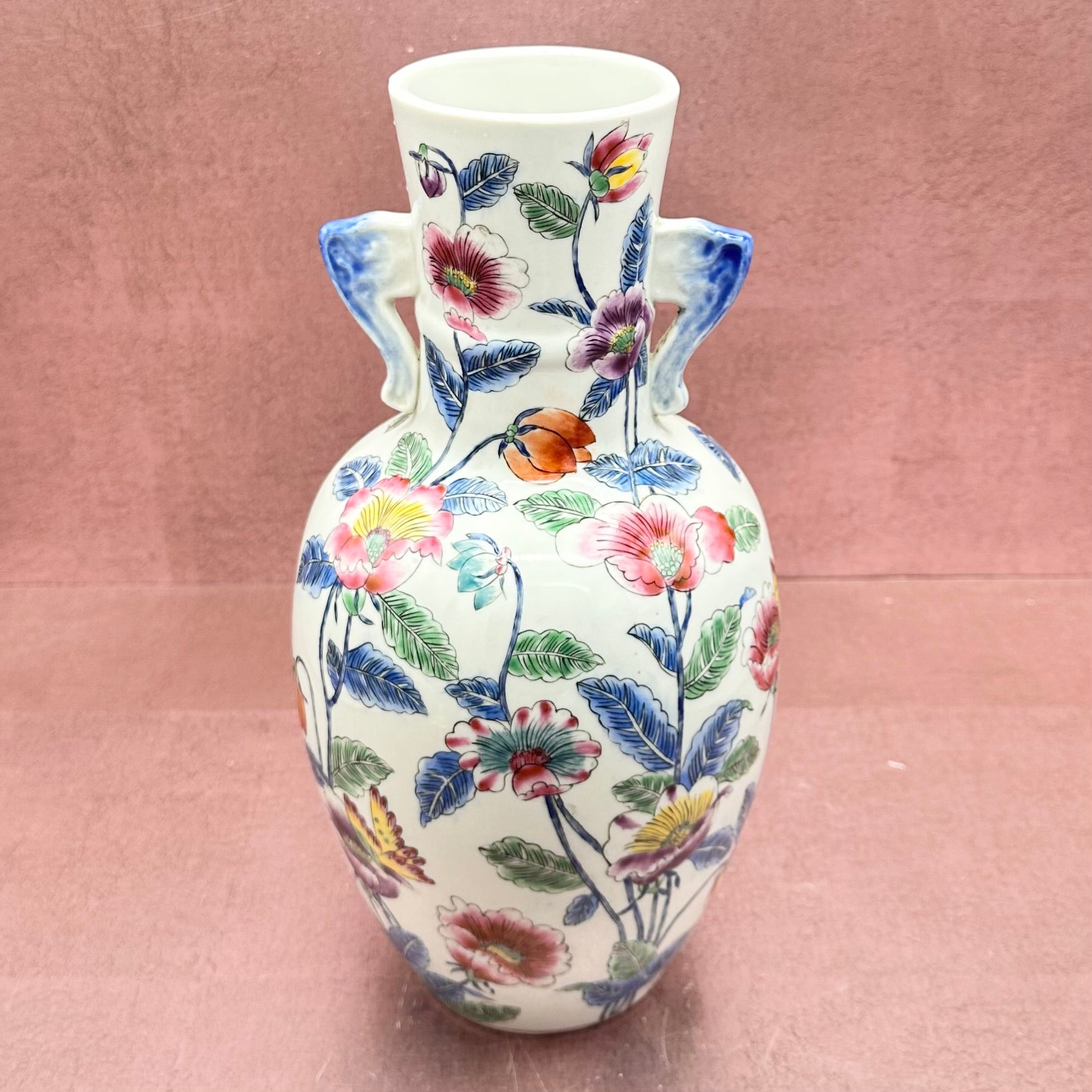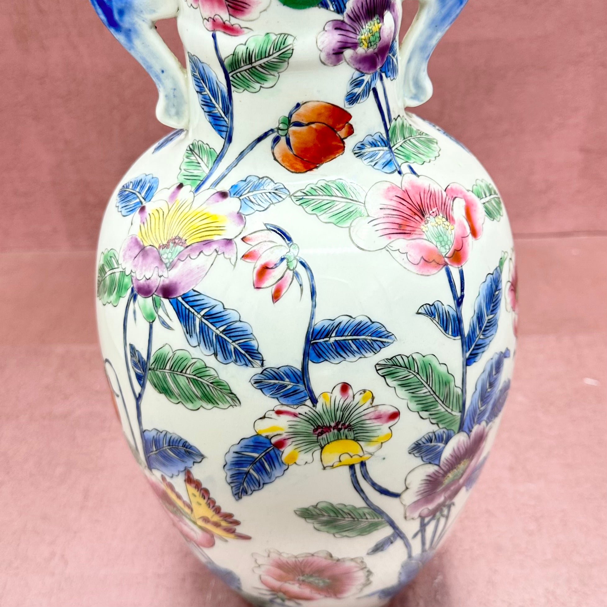 Vintage Vase Floral & Butterfly Blue Handles
